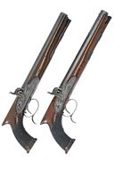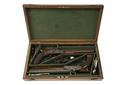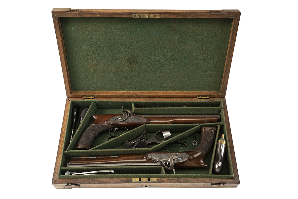 circa 1809, with later conversion to percussion probably by the manufacturer, rebrowned 10 1/4in. octagonal barrels signed 'H.W. MORTIMER & SON' over 'GUN MAKERS TO HIS MAJESTY', dove-tailed fore-sights, standing notch rear-sights to the front of the engraved and grooved top-tangs, engraved colour hardened breech-blocks, border and scroll engraved re-colour hardened locks signed 'H.W. MORTIMER & SON', further trophy engraved to the tails, scroll engraved hammers, walnut full-stocks with chequered saw-handled grips and swollen flat-based pommels, engraved oval iron caps, set triggers with engraved spurred trigger-guards also marked '89 FLEET ST'T' and horn tipped ramrods with tool ends, together with a possibly later oak case lined and compartmented in green baize ( some compartments loose) and containing a turn-screw and nipple-key, a scissors ball-mould, a later flask and sundry other accessories