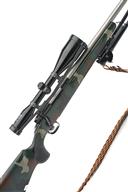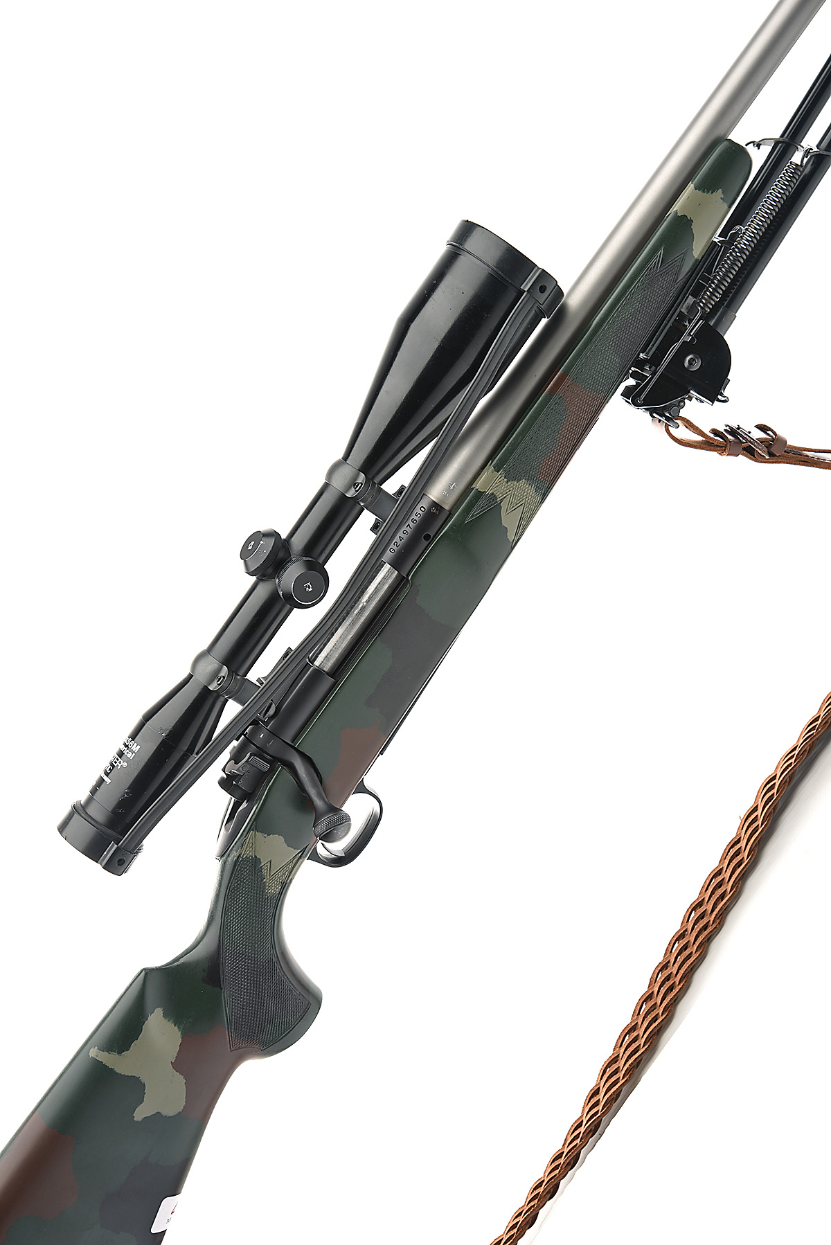 WINCHESTER .243 WIN. 'MODEL 70 SA' BOLT-MAGAZINE SPORTING RIFLE, serial no. G2497650, circa 2005, 22in. matt steel nitro barrel with AU T8 5/8F reflex sound moderator, blued receiver fitted with a Docter aspherical ZF8x56M telescopic sight, trigger unit at fault, pistolgrip stock with camouflage-effect finish, bipod, woven leather sling, 14in. pull including 1 3/4in. extension, in a padded green canvas rifle slip with reflex t8 sound moderator no. 3015