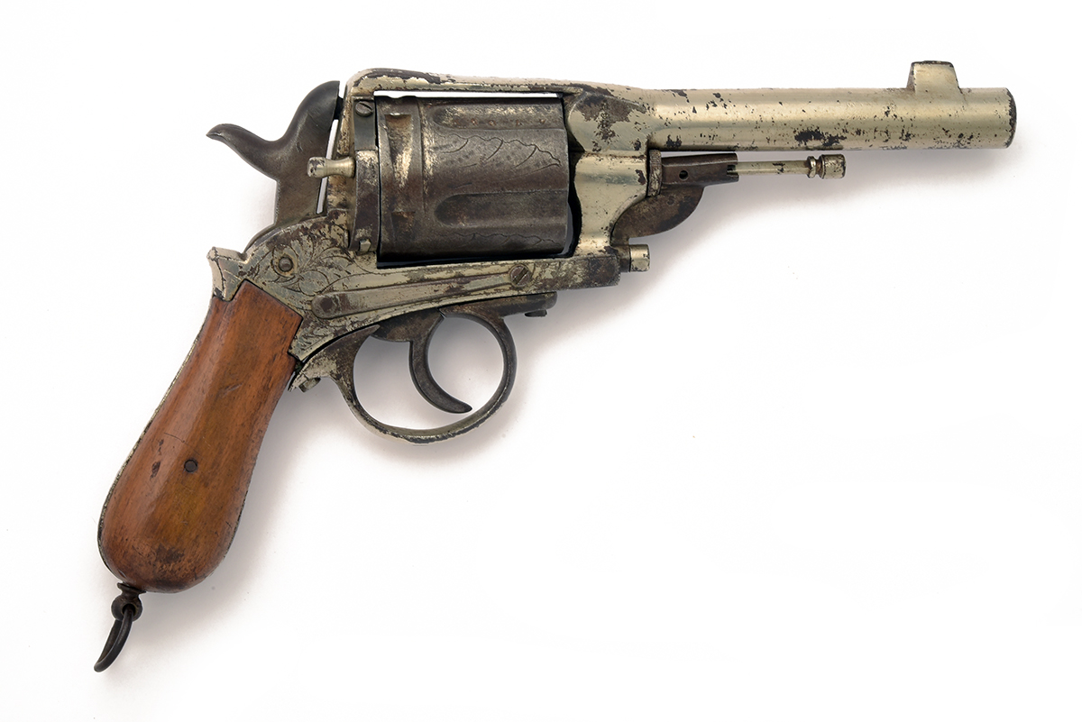 circa 1880, with round 5 in. nickel-steel sighted barrel with cross-key and crown proof-marks, closed nickel-steel frame with additional proof-marks and scroll engraving, 5-shot steel fluted and engraved cylinder with loading gate, engraved grip-straps with lanyard ring, nickel-steel trigger-guard, under-barrel ejector rod, 12 in. overall