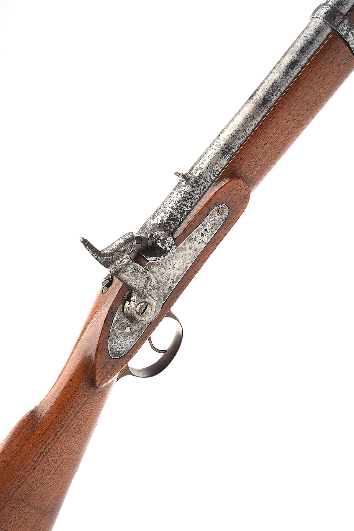 A .65 PERCUSSION PATTERN 1858 TYPE INDIAN CARBINE, no visible serial number, circa 1880, with 20 1/2in barrel with block front-sight and fixed vee block rear-sight, swivel rammer hinged at muzzle, the P53 style lock plain and unmarked, full stocked with a brass trigger-guard and iron butt-plate and nose-cap. the metal parts polished bright some deep pitting and erosion at breech and to hammer, restocked.
