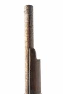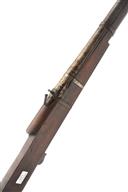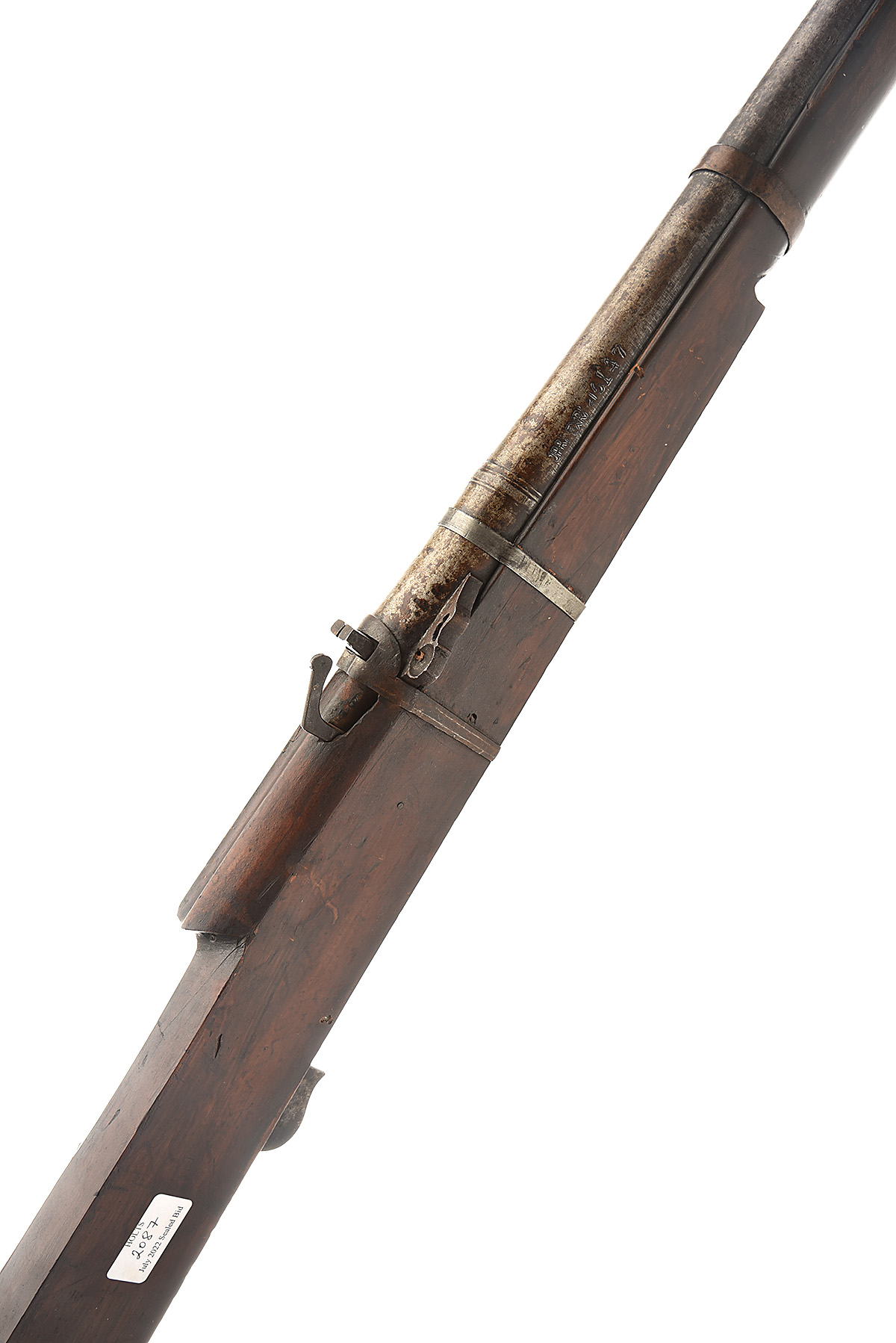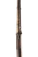 AN IMPRESSIVE .900 INDIAN MATCHLOCK RAMPART GUN FROM JAIPUR, serial no. 3306, circa 1800, with heavy 38in. barrel possibly reduced during working life, bead front-sight and fixed vee block rear-sight, the breech with inscription in Hindi, and "JPR EXP 2 16147" an export marking applied back in the 1970 / 80's when it was exported to U.K. the pan cover missing, full stocked with tiller style butt and three crude barrel bands.