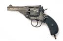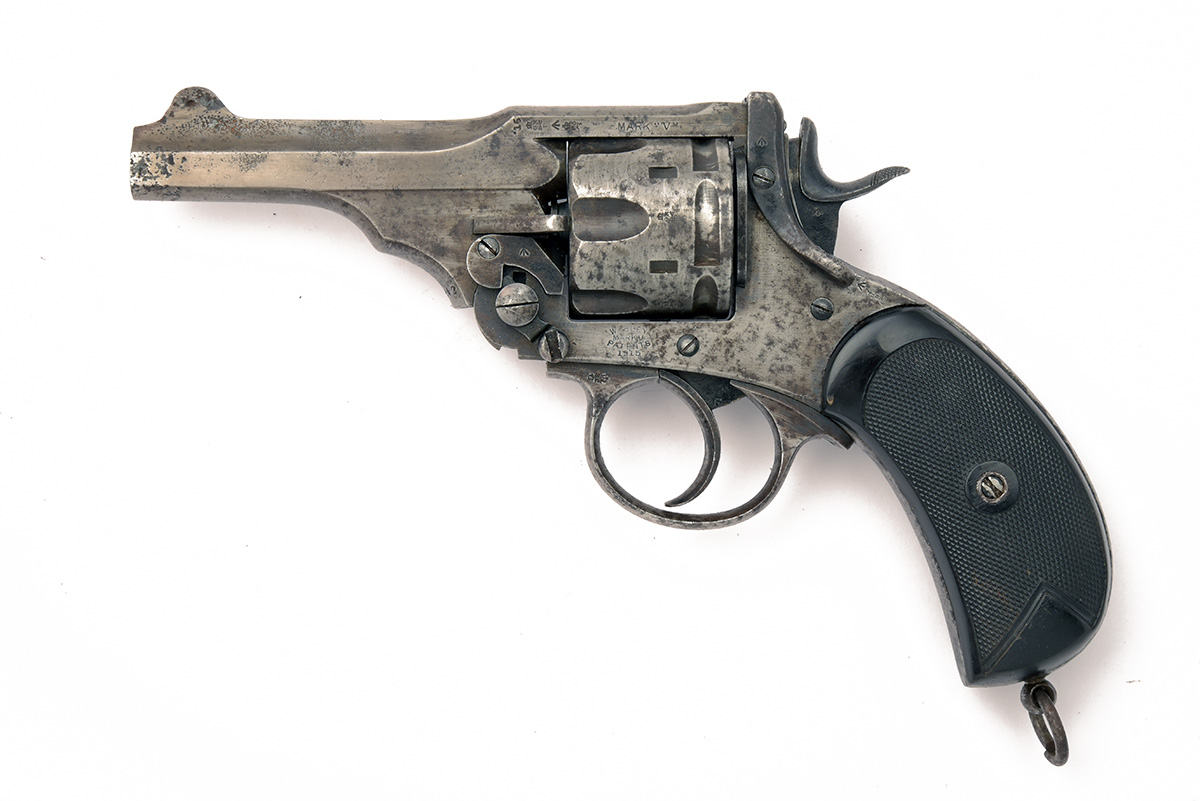 A .455 SIX-SHOT REVOLVER SIGNED WEBLEY, MODEL 'MKV',serial no.145242, dated for 1915, with 4in. barrel, fluted cylinder, break-open frame and chequered hard rubber grips, finish worn, some shallow pitting, complete with a leather holster