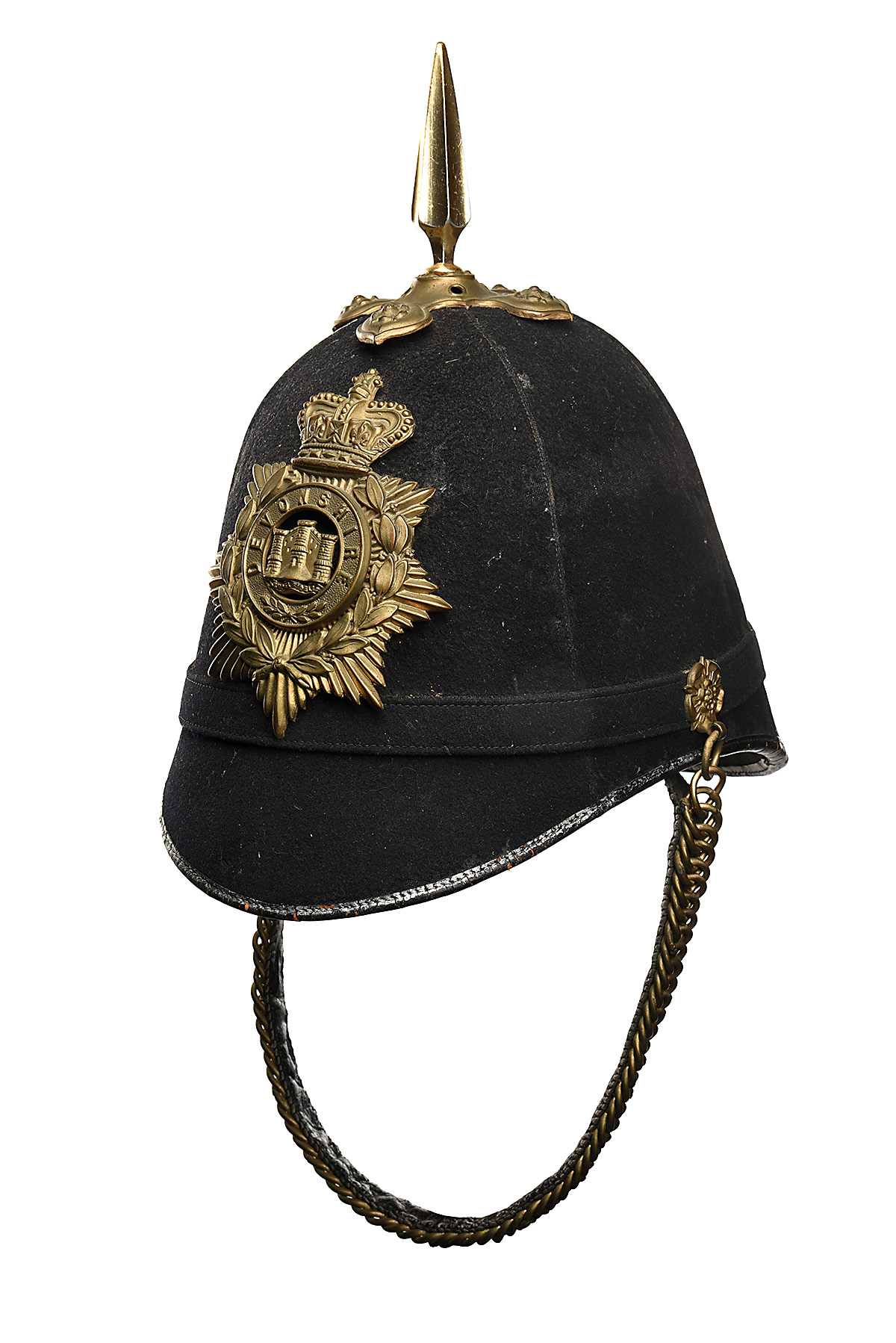 * A ROYAL MILITARY SPIKED DRESS HELMET BADGED FOR THE DEVONSHIRE REGIMENT, liner dated 1906, black felt exterior, green canvas interior, black binding,l white canvas liner with 'WD' and Board Arrow, stamped 'PROPERTY OF / THE ALDERSHOT TATTOO', size 7, various other marks/stamps, complete with brass chin-strap, worn with some exterior 'mothing'