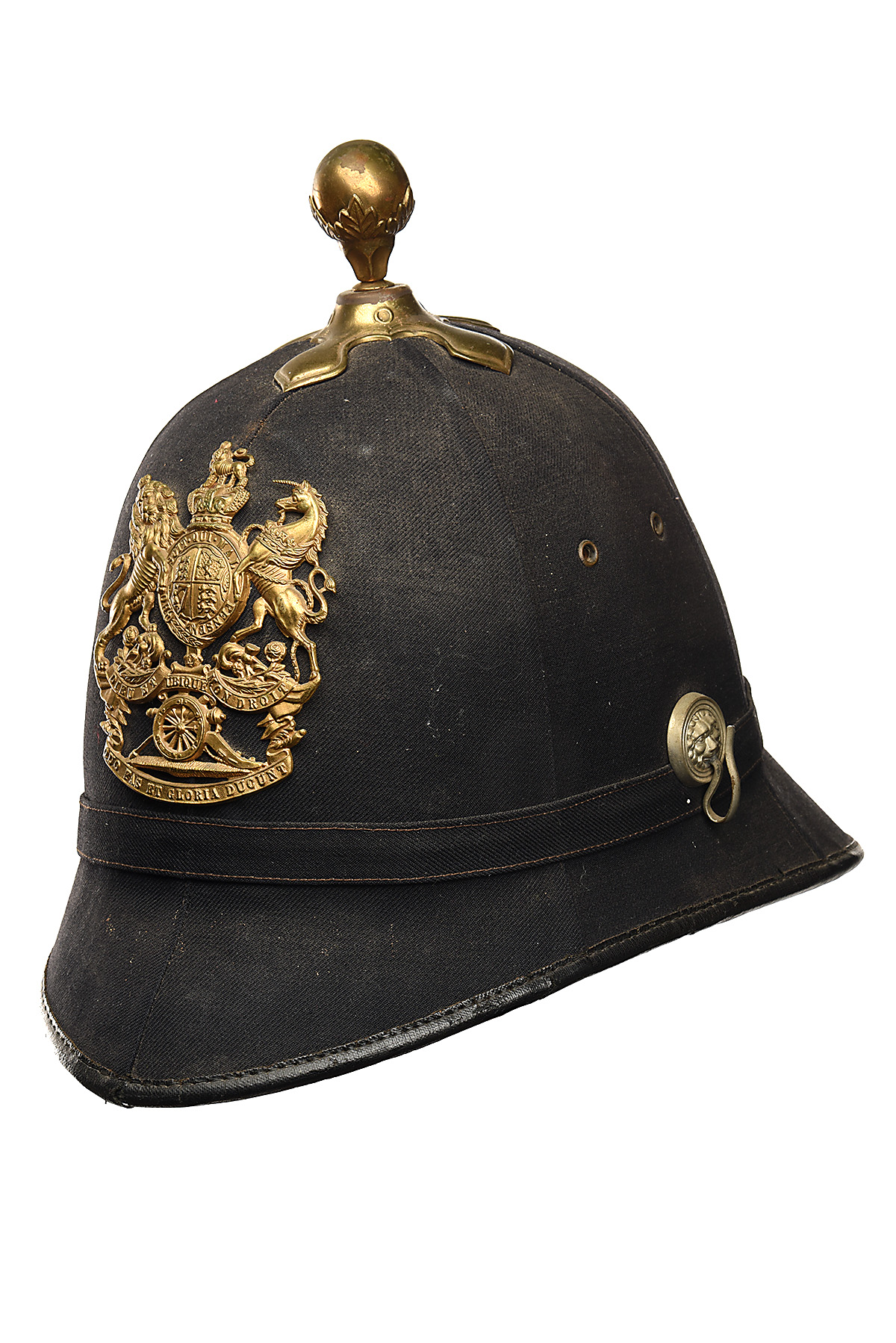 * A HOME SERVICE OTHER RANKS ROYAL HORSE ARTILLERY HELMET, circa 1890s, black canvas with green interior, ball finial, brass badge, black leather binding, one air hole missing its metal surround and some wear to the interior
