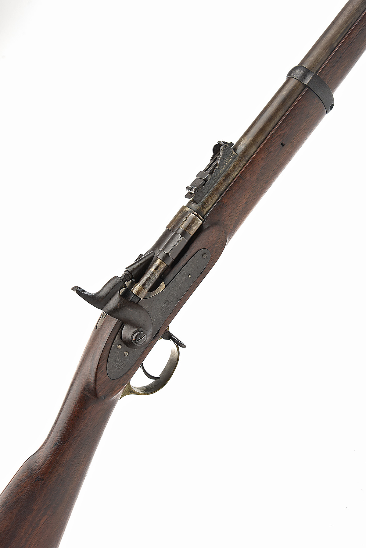 A .577 SNIDER MK II** THREE BAND VOLUNTEER BREECH-LOADING RIFLE BY THE LONDON ARMOURY COMPANY CIRCA 1868, NO VISIBLE SERIAL NUMBER, with 36 1/2. Birmingham proofed barrel rifled with three grooves block and blade front-sight, standard P53 style ladder rear-sight, the breech with acknowledgement to Snider's patent, the lock stamped with the Crown G.R. cypher on the tail and '1863 / L. A. Co' to the centre, regulation brass mounted full walnut stock the butt impressed with a London Armoury Co. roundel dated 1863, this rifle was originally made for private sale in 1863 and later converted to a Snider breech-loader, complete with sling swivels and rod,