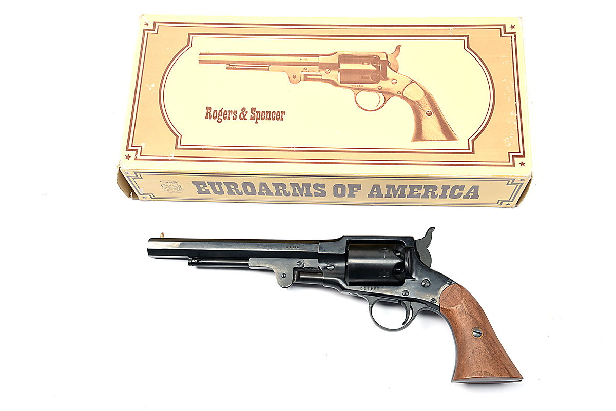 A BOXED REPRODUCTION .44 PERCUSSION REVOLVER SIGNED EUROARMS, MODEL 'ROGERS & SPENCER' serial no. 24599, with blued octagonal 7 1/2in. barrel, solid frame, plain cylinder and smooth walnut grips, appearing unused in its maker's card and polystyrene carton