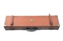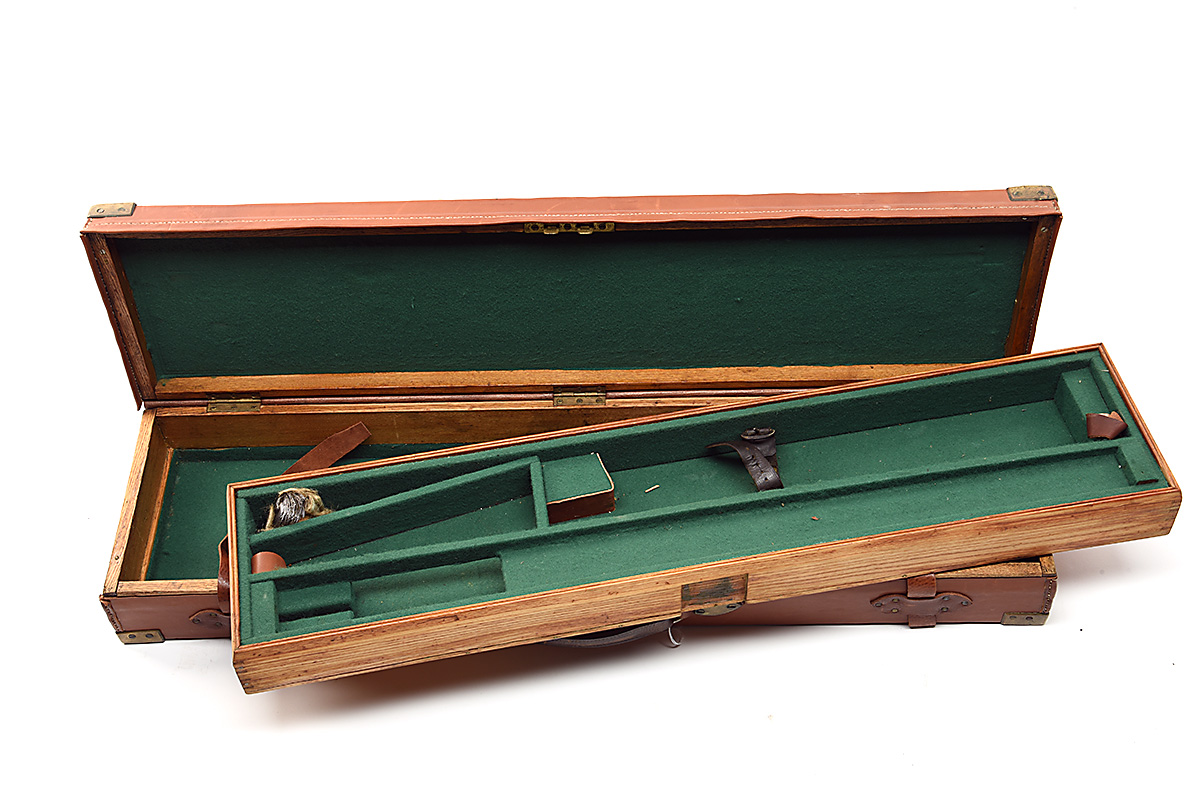 A BRASS-CORNERED LEATHER TWO-TIER GUNCASE, fitted for 30in. barrels, the interior re-lined with green baize, top tier fitted for a single gun, no boxing on the bottom tier, brass lock (key missing), the lid exterior with a central blank brass escutcheon