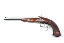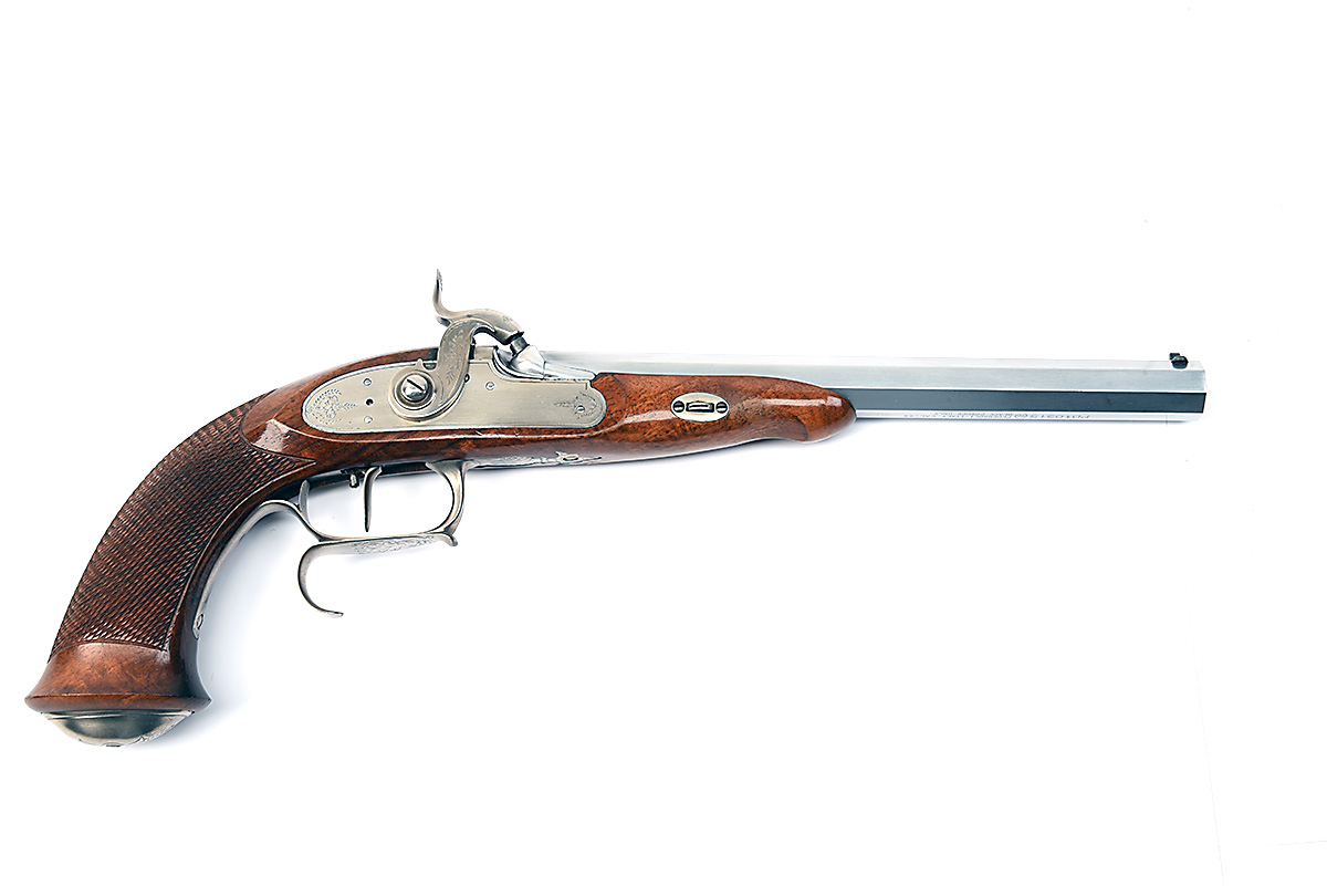 A REPRODUCTION .44 PERCUSSION PISTOL SIGNED PEDERSOLI, MODEL 'LE-PAGE', serial no. PD10315, with stainless rifled octagonal 10in. barrel, borderline engraved lock and walnut half-stock with chequered grip, fitted with set trigger