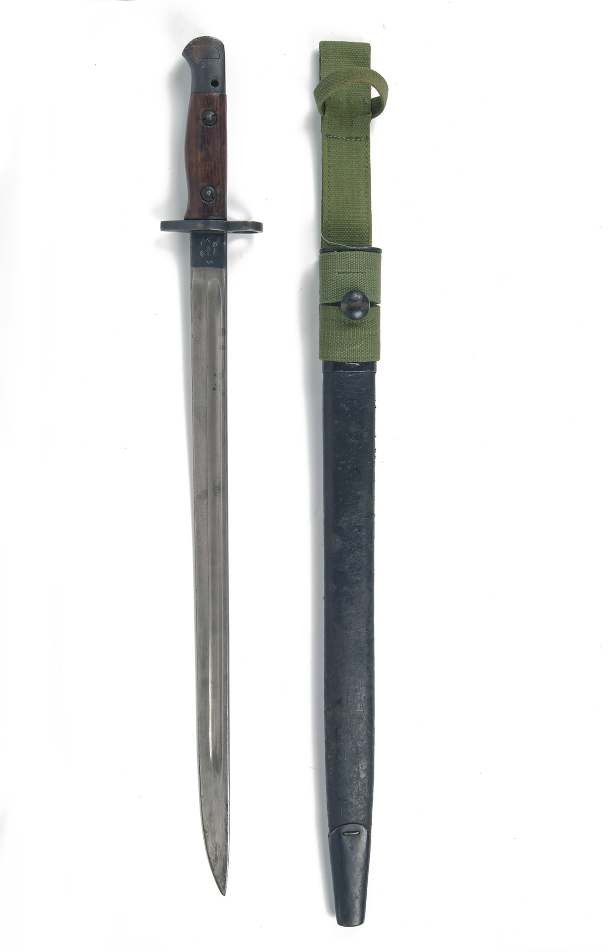 A GOOD WORLD WAR I PATTERN 1907 SWORD BAYONET, dated 1917, with 17 in. single-edged steel blade, fullered on each side, ricasso marked with king's crown, 'G. R. / 3. 17 / SANDERSON' with Broad Arrow, bend test 'X' and various inspection marks over, blued steel hilt with rivited wooden grips, pommel marked '2 N / 43', black leather scabbard with steel fittings, together with a green canvas frog stamped with Broad Arrow, maker's details and '42', a little pitting to top of pommel and some scruffs to the scabbard, 22 1/2 in. overall
