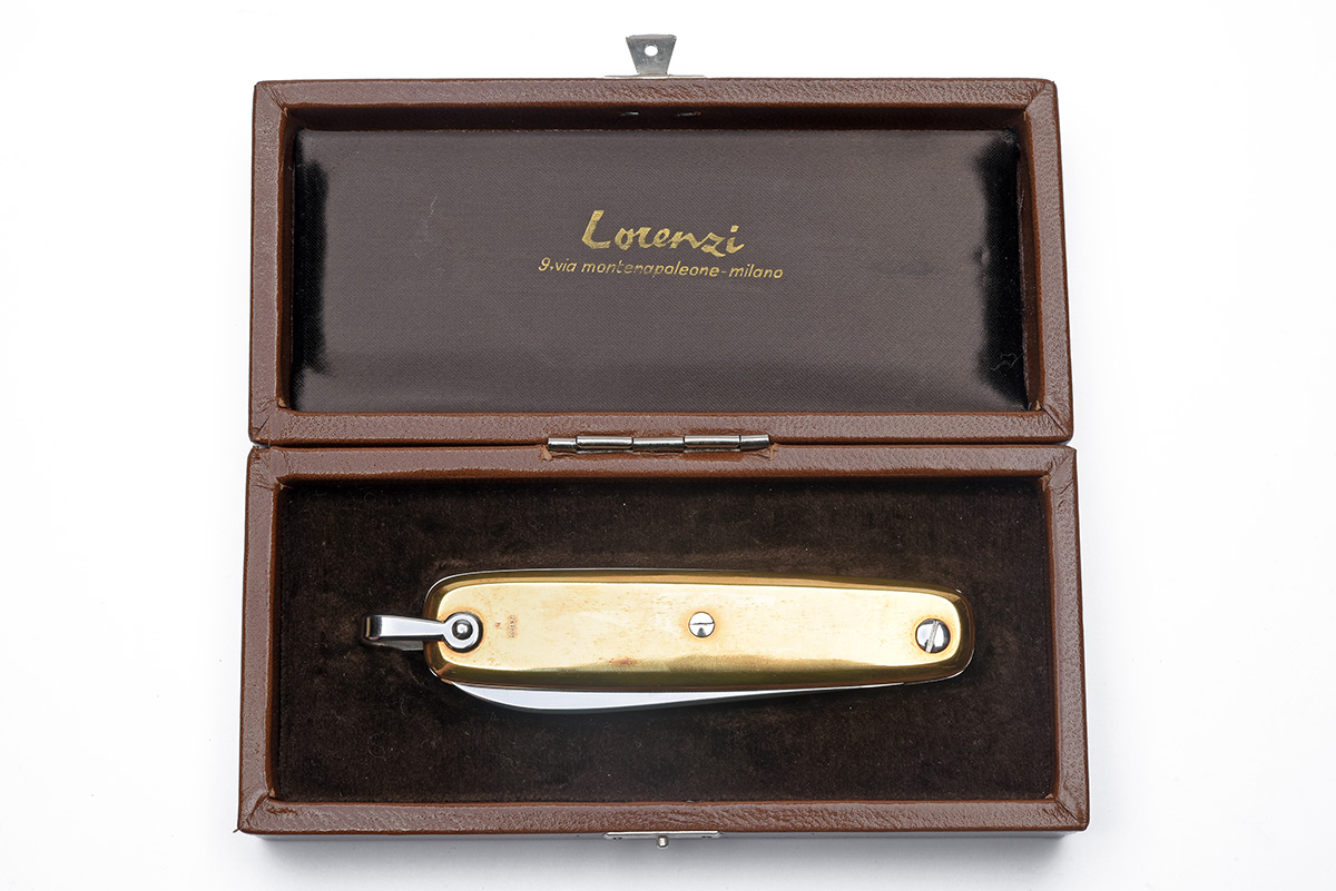 with 3in. spearpoint blade marked on the left side 'NOCENT INOX' together with a letter 'L' within a square border, plain yellow 18k gold scales both stamped '750' (no further hallmarks), the right also marked 'LORENZI', lanyard loop to rear, in a Lorenzi, Milano leather box
