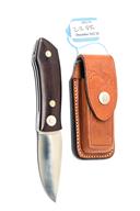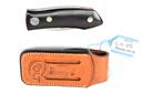 A RARE "BARRY WOOD" COLT SWING-LOCK KNIFE RETAILED BY LORENZI OF MILAN, circa 1970s, with 3 1/2 in, stainless steel blade, maked 'COLT / HARTFORD CT.', pivot button with Colt 'prancing horse' logo, inside of grip with 'G. Lorenzi / MILANO' label, contoured brass-rivited grips, together with its hard leather case with belt-loop, embossed 'prancing horse logo to the front and 'Colt' logo plus 'G. Lorenzi / via Montenapoleone / MILANO' to the rear, appears unused, 7 1/2 in. open, 4 1/4 in. closed