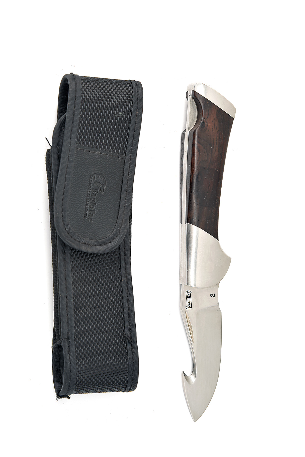 A GOOD MODERN HUNTING LOCK-KNIFE BY HARLEY, nickelled-steel with shaped hard-wood grips, 2 3/4 in, blade with barbed back marked 'HARLEY / 2', together with an associated canvas pouch marked 'EagleTac', appears unused, 7 in. open, 4 1/4 in. closed