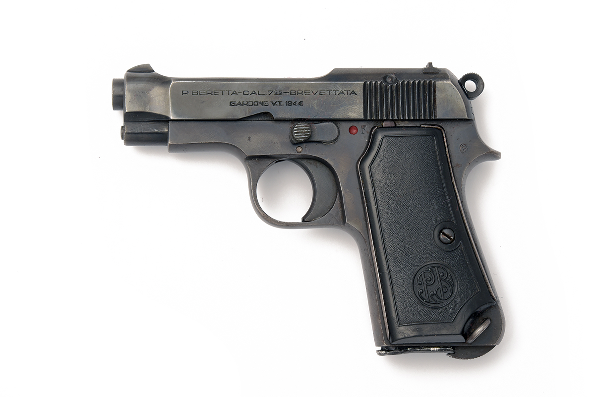 A .32 (ACP) BERETTA M34 SEMI-AUTOMATIC PISTOL, serial no. 542382, wartime production with exposed 3 1/4in. barrel, open slide, blued frame, stippled plastic grips (missing finger base from magazine)