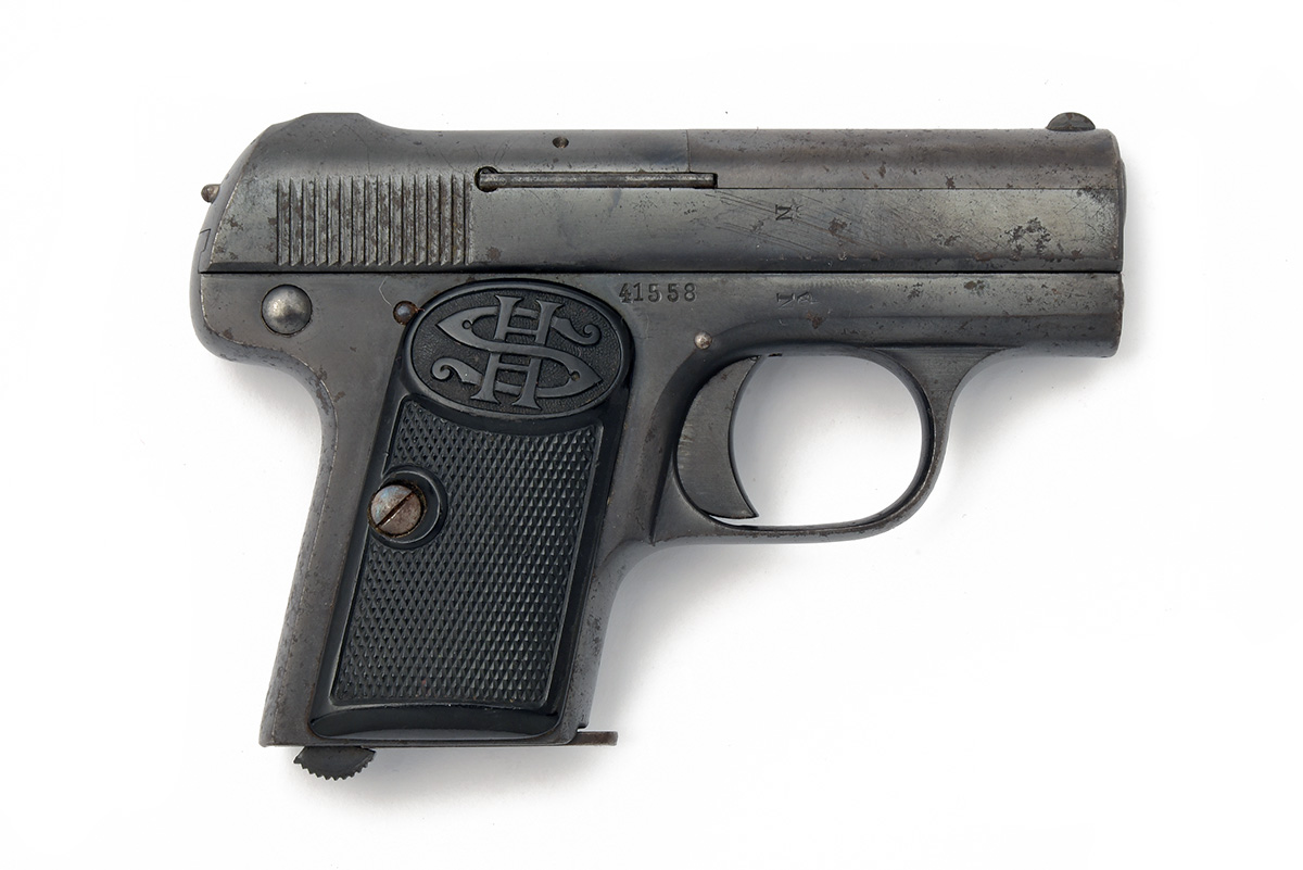 A 6.35mm (.25 ACP) HAENEL SEMI-AUTOMATIC POCKET-PISTOL, MODEL 'SCHMEISSER'S PATENT MODEL I', serial no. 41558, circa 1925, with concealed 2in. barrel, blued fully enclosed slide, blued frame and chequered hard rubber grips