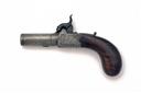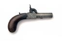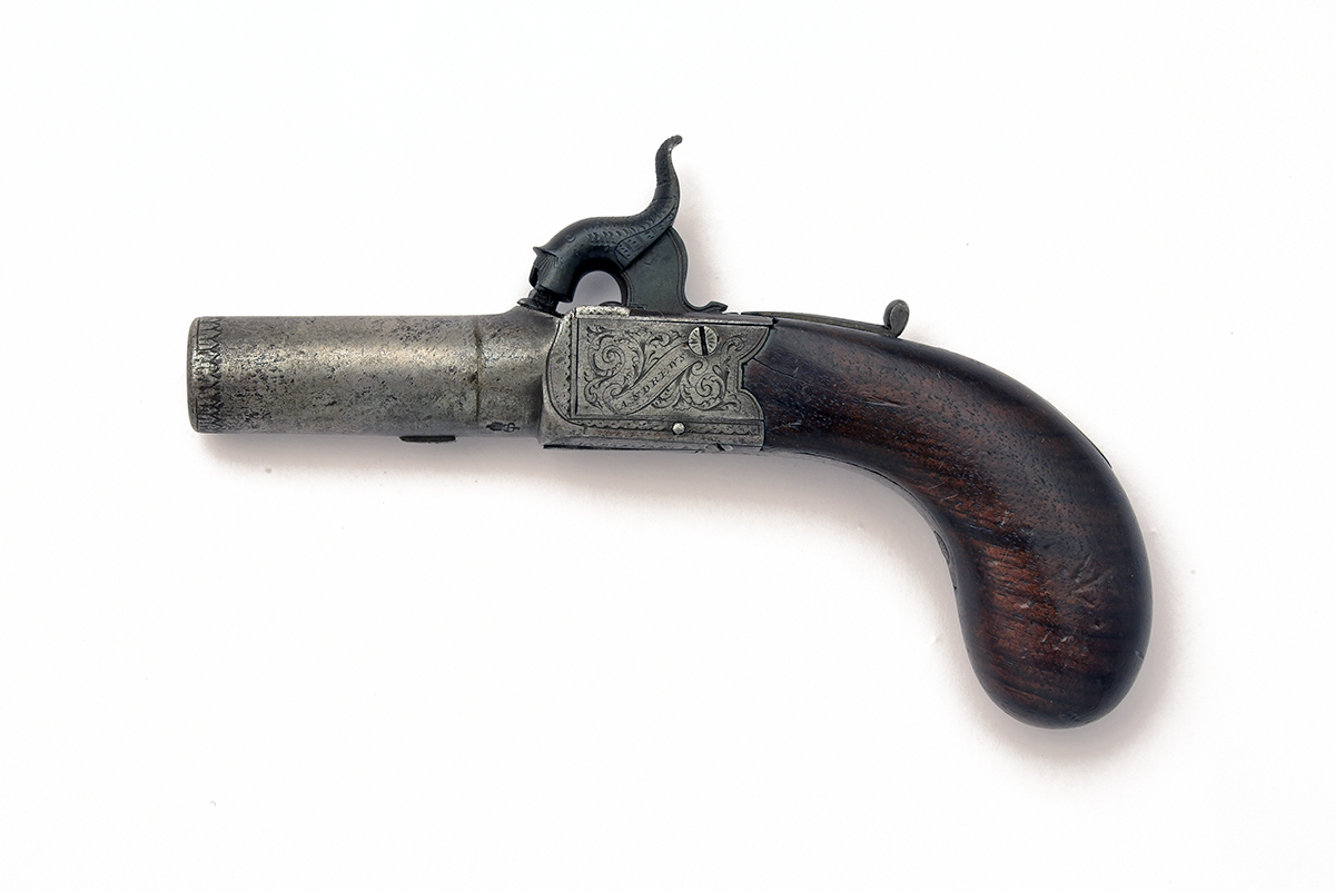 A 54-BORE PERCUSSION BOX-LOCK MUFF PISTOL SIGNED ANDREWS, no visible serial number, circa 1810 flintlock converted to percussion, with 1 3/4 in. turn-off steel barrel, scroll-engraved box-lock with engraved tangs, marked 'ANDREWS' to one side and 'LONDON' opposite, blued dolphin hammer, sliding safety, wooden bag-shaped butt with unengraved oval white metal escutcheon, drop-down trigger, some cleaned light pitting, minor knocks to the butt, closed split behind lock on left side of butt, 6 in. overall