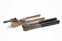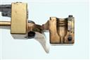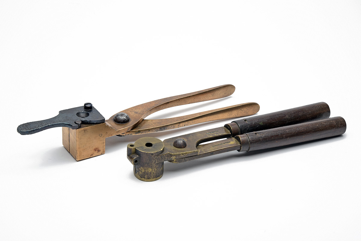 A PAIR OF BULLET-MOULDS, 1) brass, stamped '577' and numbered '7942', rusting and pitting to the sprue-cutter, 10 1/4 in.; 2) brass with wooden handles, stamped '27' and 'CHAS INGRAM', missing sprue-cutter, 9 1/4 in.