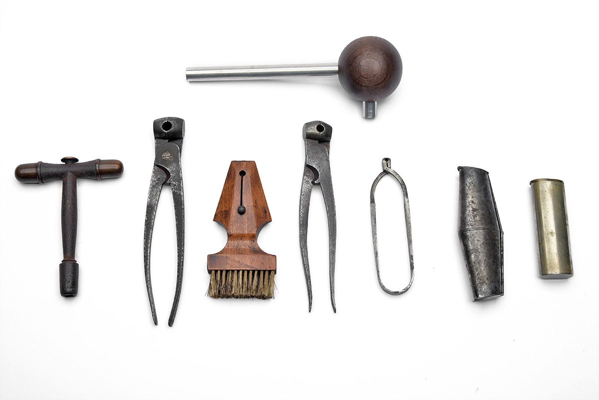A MIXED GROUP OF ACCESSORIES, various periods, including two small scissor bullet moulds, a steel double-ended shot charger, a single-ended shot charger, a combined nipple-key and oiler with screw-off brass handle ends for containing nipples, a small cleaning brush with retractable steel brush in the handle; a modern ball-starter, etc