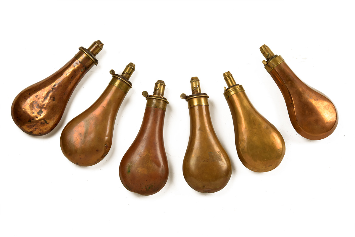 A GROUP OF SIX PLAIN BAG COPPER AND BRASS POWDER FLASKS FOR SPORTING GUNS,