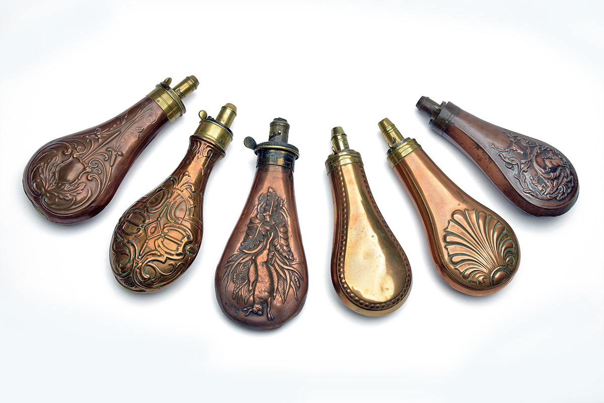 A GROUP OF SIX EMBOSSED COPPER AND BRASS POWDER FLASKS FOR SPORTING GUNS,