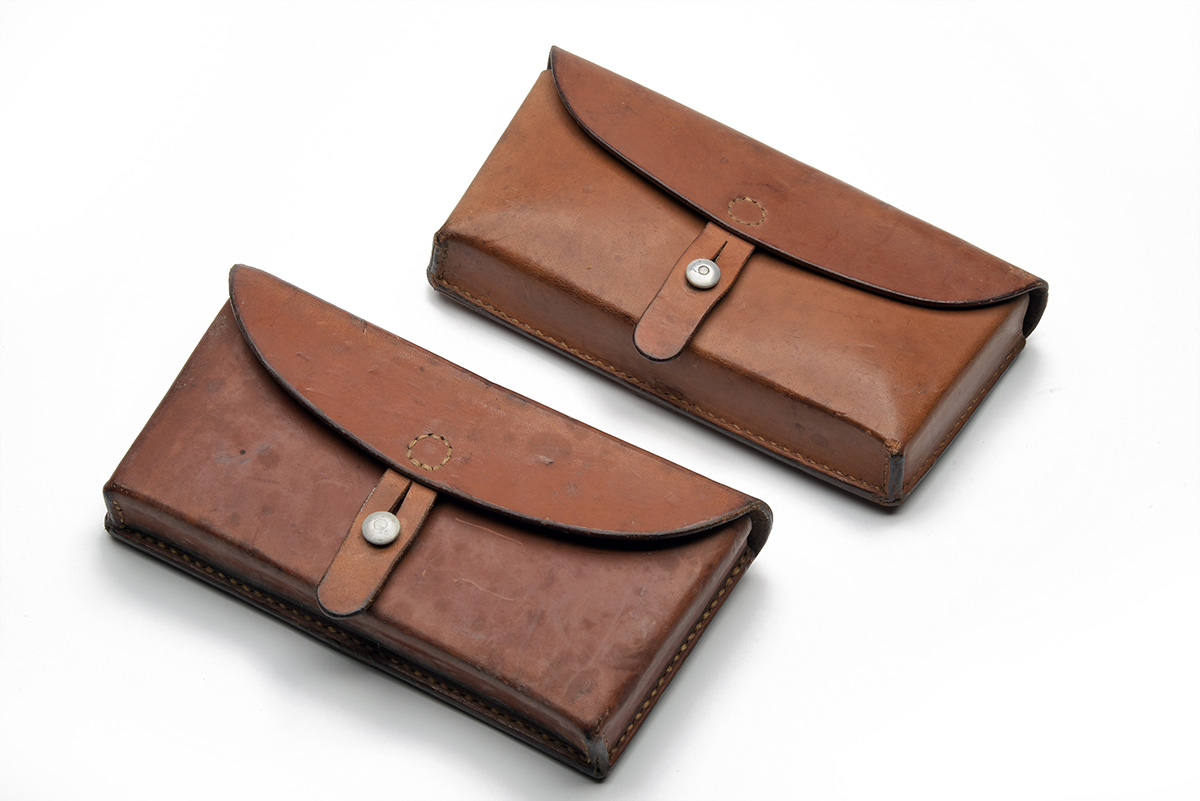 A PAIR OF GOOD SWISS AMMUNITION POUCHES FOR THE K31 AND VETTERLI RIFLES, both dated for 1965, brown leather, backs stamped with boxed Swiss cross and 'M', one maker-marked 'A.UPPENER / GAMS', the other 'B,LEHMANN / SATTLER / ABTWIL St. G.', service wear, stitching tight