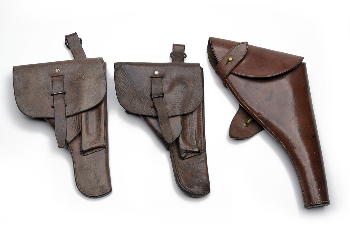 A GOOD OFFICERS PRIVATE PURCHASE WEBLEY HOLSTER PLUS A PAIR OF FRENCH WORLD WAR II MAB MODEL D PISTOL HOLSTERS ,