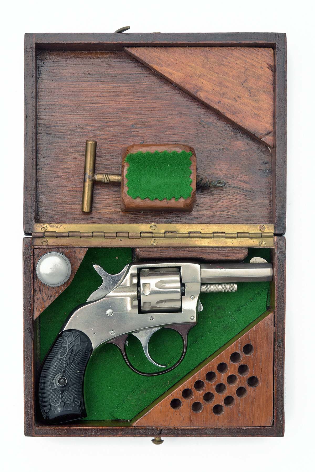 A .22 (SHORT) HARRINGTON & RICHARDSON YOUNG AMERICAN DOUBLE ACTION REVOLVER, serial no. 316778, with plated 2in. barrel, fluted cylinder, solid frame and chequered hard-rubber grips, in a later wood box with oil bottle and cleaning rod