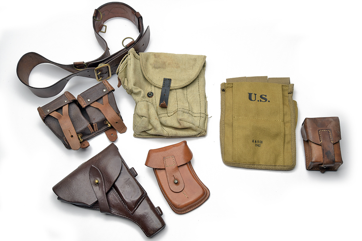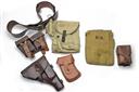 A GROUP OF SEVEN MIXED ACCOUTREMENTS. being 1) a Sam Browne belt; 2) a post-war Mauser ammo pouch; 3) a canvas magazine pouch for x4 AK-47 mags; 4) a post-war twin pouch for the Mosin Nagant; 5) a 1942 dated US ammo pouch for three Thompson magazines, marker marked 'K & S CO', unused; 6) a twin magazine pouch for the Czech Scorpion SMG; 7) an unknown, possibly French or Belgian brown leather pistol holster; all used bar 5) above, with service wear but no splits or tears