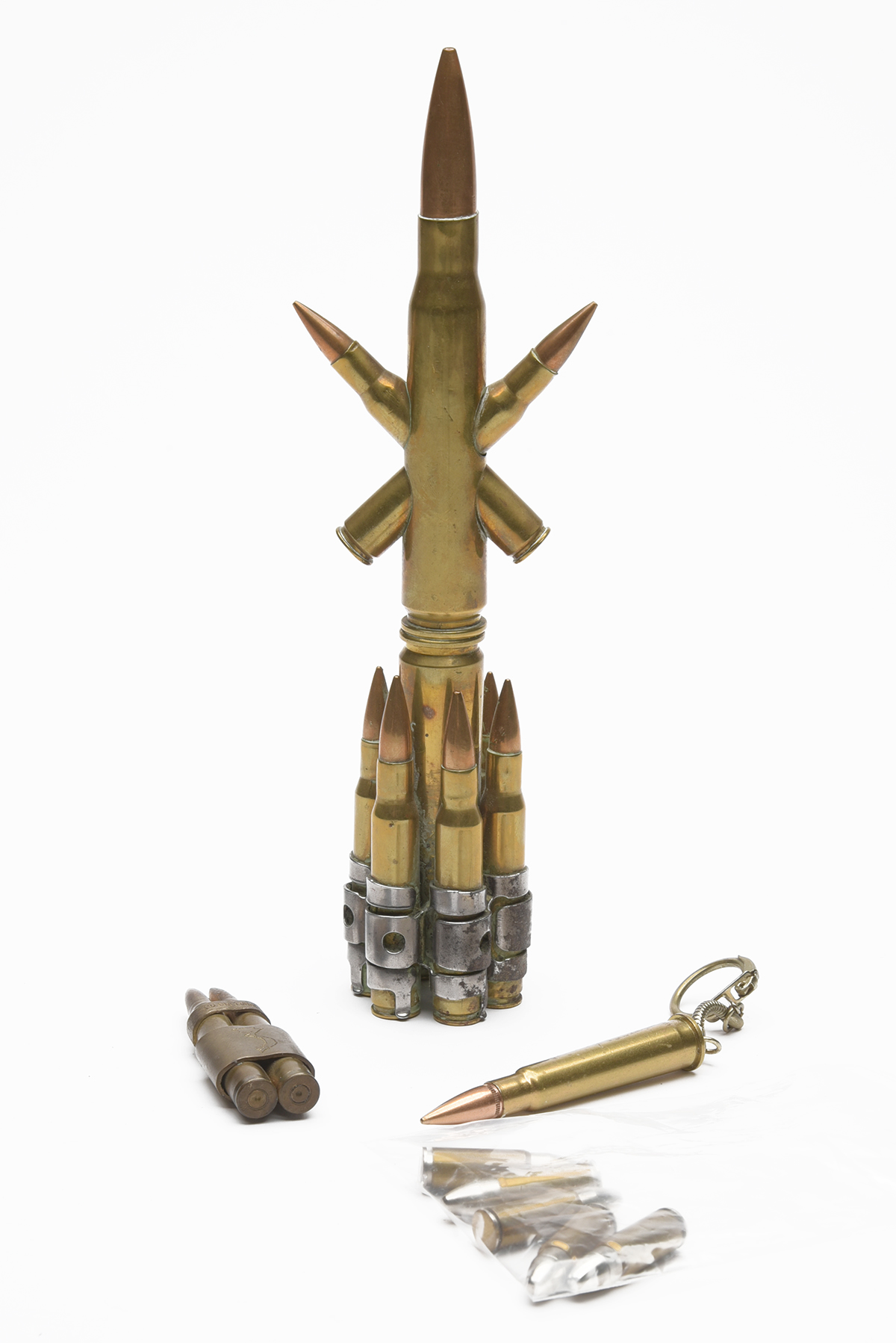 A GROUP OF POST-WAR TRENCH ART PIECES MADE FROM INERT CARTRIDGES, being, 1) a 1950s Korean War memorial piece constructed from spent cases and heads, mostly 30-06, 9 in. high; 2) a lighter constructed from two spent rounds, bound with brass bands decorated with a map of Vietnam and a dove of peace, and inscribed VIETNAM / CUCHI TUNNEL'; 3) a 1980s keyring made from a Greek HXP .303 cartridge; 4) x5 dummy rounds with screw-off heads
