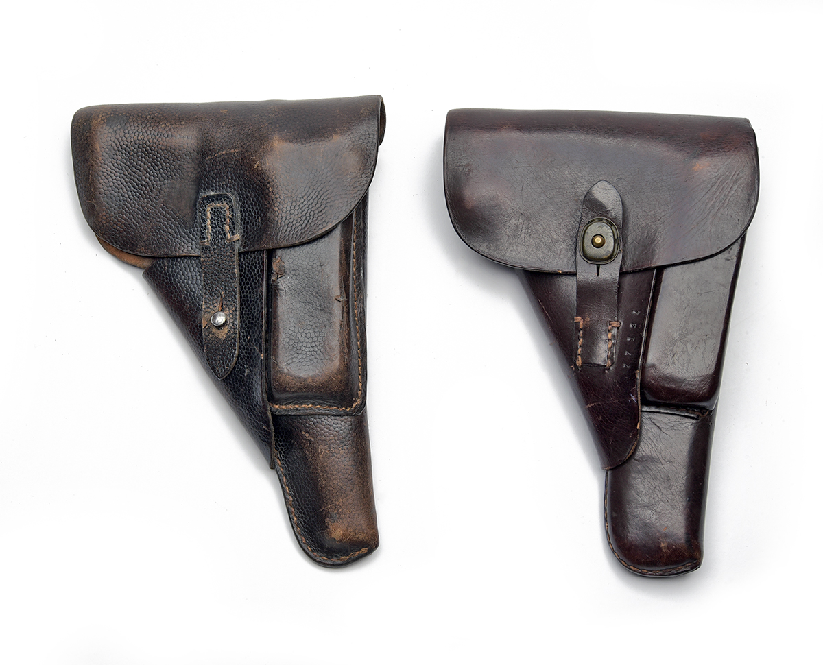 A PAIR OF GERMAN WORLD WAR TWO PISTOL HOLSTERS, 1) for a Walther P38, black leather pebble-grain softshell, reverse stamped 'P38', manufacturer's code 'CXE' for Britzer Eisenwerk Paul Szubinski, with a '4' below, service worn, tight stitching, graze on magazine pouch; 2) for a P35 Browning, brown leather softshell, manufacturer's code 'clg' for Ernst Melzig, Liegnitz stamped under tab with date '44', serial number '77124' stamped vertically alongside magazine pouch relates to a P35 9mm Browning, light service wear, replacement tab release stud