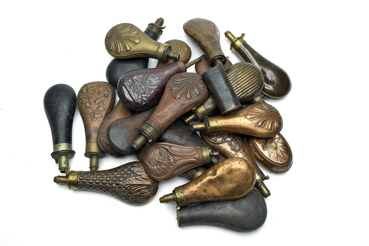 A MIXED GROUP OF 24 POWDER FLASKS mixed periods, mostly late 19th to early 20th Century, some leather covered, some named, including Hawksley and Dixon, very mixed condition, many with significant faults
