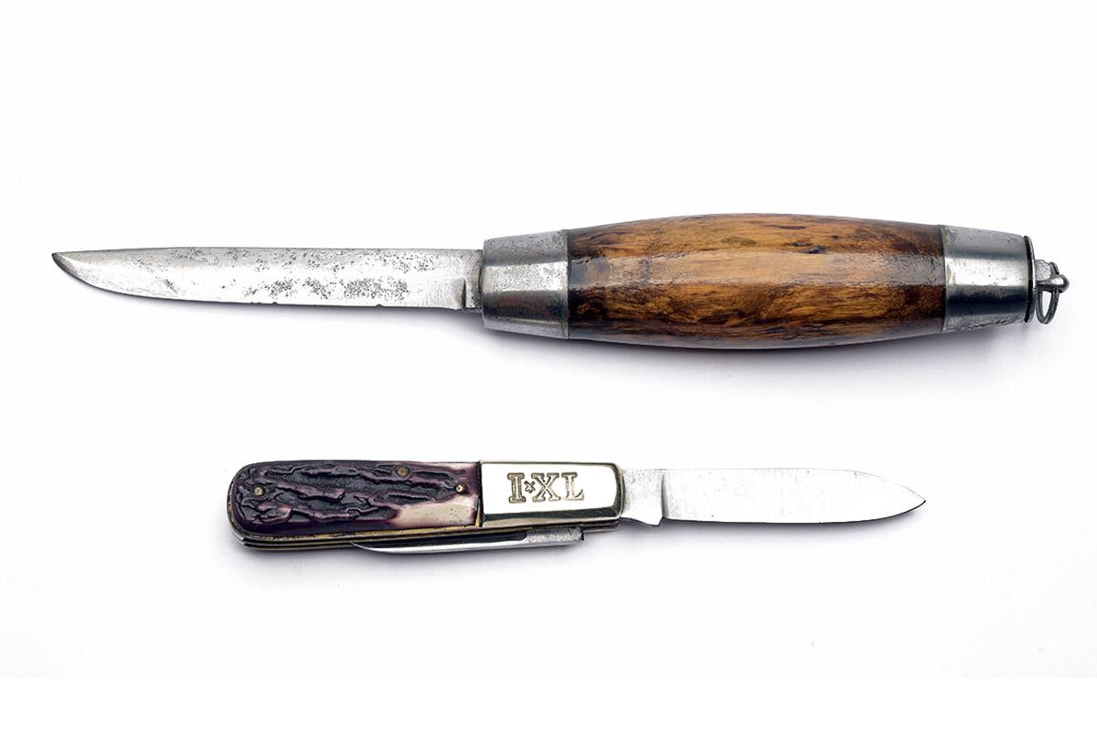 A SWEDISH BARREL KNIFE AND GEORGE WOLSTENHOLM I.XL KNIFE, ) a mid-20th Century Swedish Barrel Knife/SLOJD with 4 in. single-edged steel blade, internal case marked 'P. HOLMBERG / ESKILSTUNA / SWEDEN', cleaned pitting on blade, 9 in. extended, 5 1/2 in. closed; 2) modern two-bladed pocket knife, with 2 1/2 in. and 1 1/2 in, steel blades, ricasso stamped 'I.XL / GEORGE / WOLSTENHOLM / SHEFFIELD', plastic faux antler grips, appears very lightly used, 6 14 in. max. open, 3 1/2 in. closed