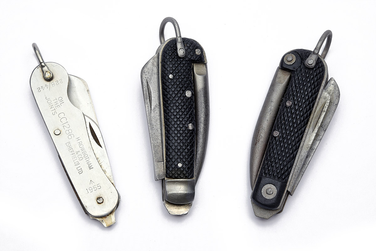 A GROUP OF THREE MILITARY ISSUE CLASP KNIVES, being 1) can opener ricasso dated 1942 with Broad Arrow above, blade marked 'ROGERS & SON / 5 NORFOLK St / SHEFFIELD / ENGLAND', marlin spike loose; 2) can opener ricasso dated1942 with Broad Arrow alongside, additionally marked 'W & S. B. / SHEFFIELD'; 3) dated 1955, stamped '22B/442 / OIL / THE / JOINTS / 446/I\ / CCI286 / H. ROWBOTTOM / & CO / (SHEFFIELD) LTD. / /I\ / 1955'; all 6 3/4 in max. open. 4 in. closed