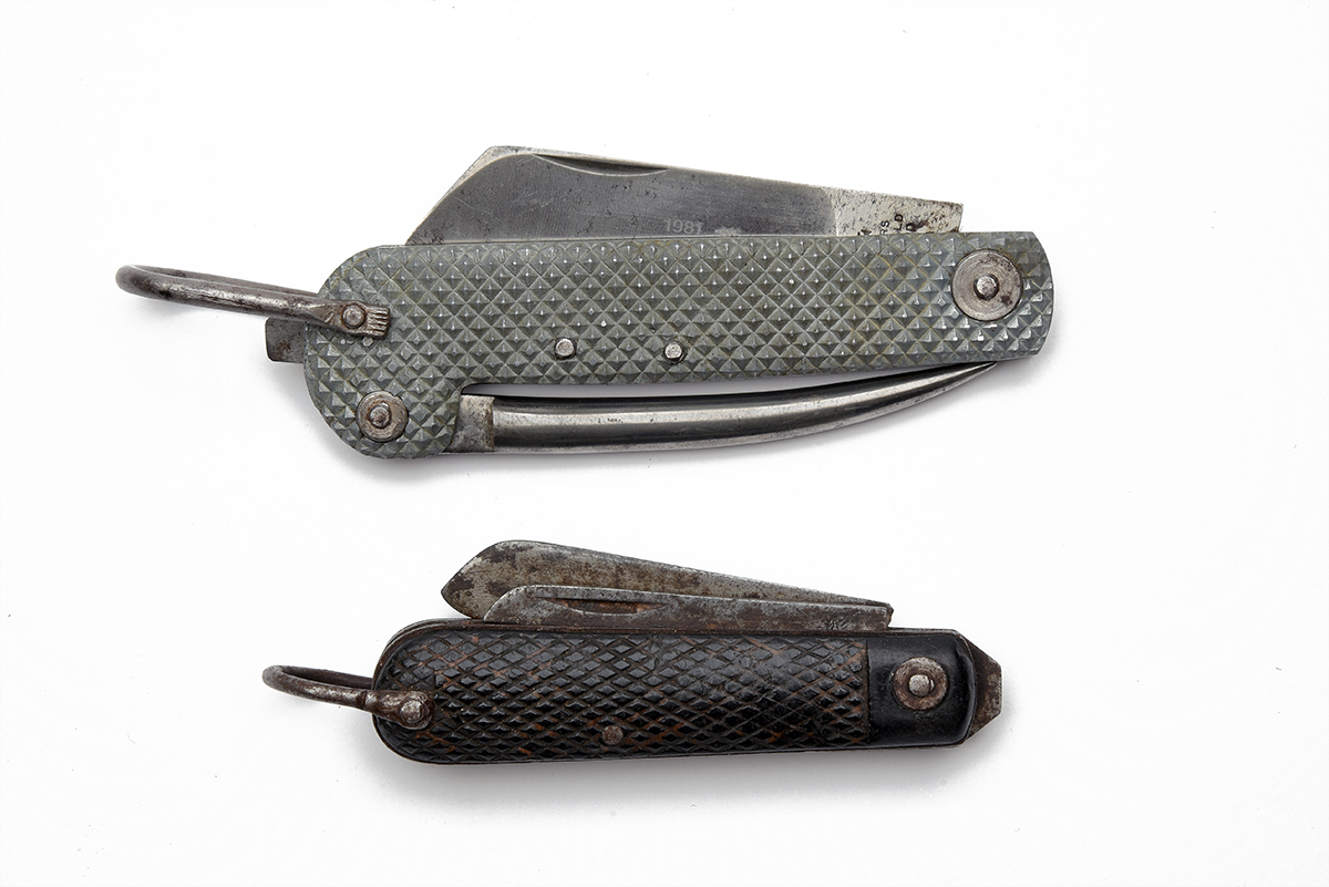 A PAIR OF MILITARY ISSUE CLASP KNIVES, 1) dated 1981, naval issue, spike and blade, side panel owner-stamped 'LEES', ricasso marked 'RODGERS / SHEFFIELD / ENGLAND' with '21306' over, blade etched '1981 Broad Arrow / 571-3619'; 2) dated 1943, army issue, blade and opener, opener ricasso marked 'Broad Arrow / 1943 / TAYLOR / SHEFFIELD / ENGLAND' with 'eye' trademark and 'WITNESS' alongside, worn with tarnish, blade does not fully close, rare maker