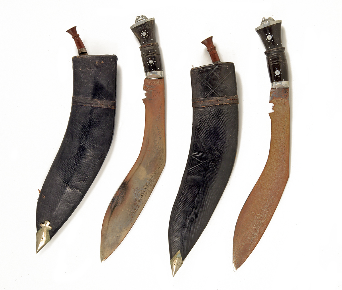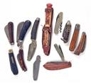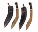 A GROUP OF 15 MIXED KNIVES AND TWO TOURIST KUKRIS, mid-late 20th Century, includes pruning knives, bar-tender knives, multi-tools, etc., some maker-marked, plus two Indian Kukris with 12 in. blades, black wooden grips, lion-head pommels, each with their black leather scabbards and single smaller knives, worn, each 17 in. overall