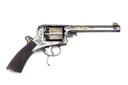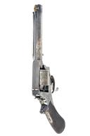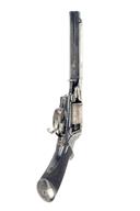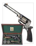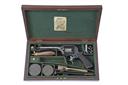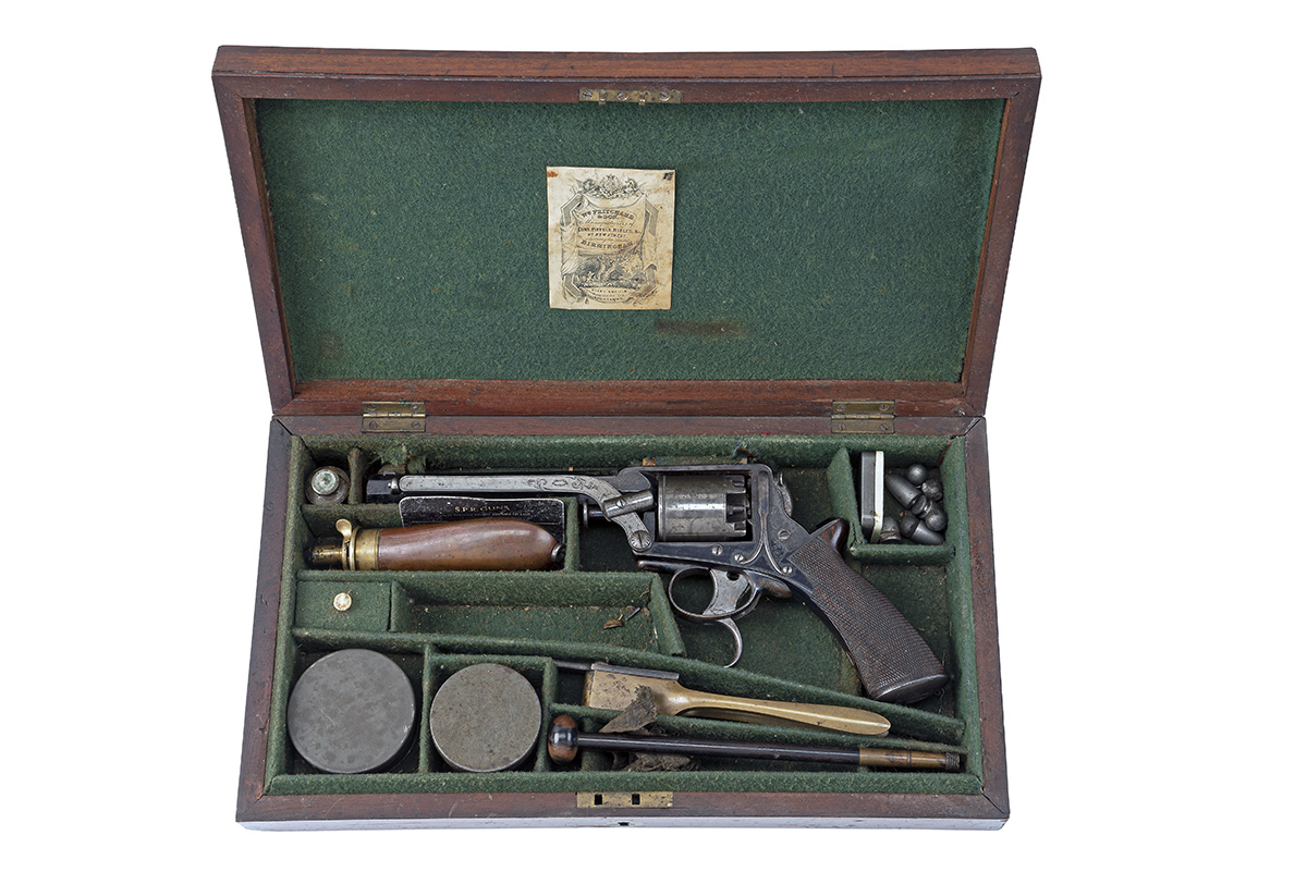with 6in. octagonal barrel, the muzzle decorated with an engraved band, large dovetailed brass front-sight (replacement) the top strap signed with the retailers name 'W. PRITCHARD & SON BIRMINGHAM', the frame with borderlines and foliate scroll decoration, engraved on the right side with the Tranter serial number 'No 7839T', the revolver is fitted with Tranter's patent 3rd type lever rammer on the left of the barrel and action, together with the pronged action safety spring, and on the right it has the Tranter 'S' shaped arbour retaining spring catch, five shot cylinder engraved with borderlines around the nipple wells and a knurled band to the cylinder's leading edge, chequered walnut grips with domed foliate engraved butt-cap, the revolver is contained in its original green baize lined and partitioned mahogany case, (some partitions loose) the inside of the lid displays the original W. Pritchard & Son trade label with 97 New St. Birmingham address, accessories include correct Dixon copper bodied flask, lever spring missing, double cavity Tranter mould numbered to the gun, cleaning rod, oil bottle, bullet tin, cap tin, the revolver is in very good condition with a large percentage of deep original charcoal blue