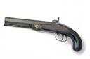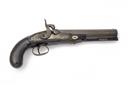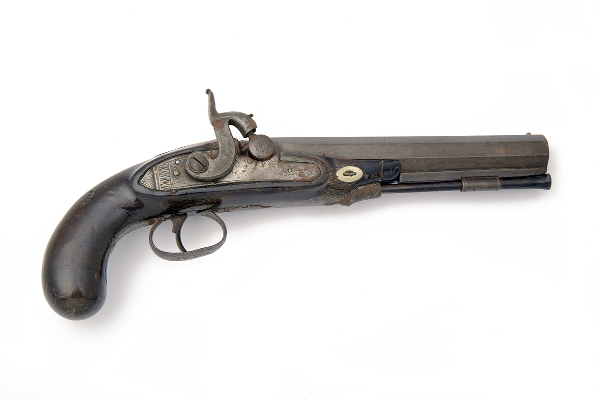 A 25-BORE PERCUSSION PISTOL BY NOCK CONVERTED FROM FLINTLOCK , CIRCA 1800, no visible serial number, with 8 in octagonal barrel, the top flat faintly inscribed 'LONDON', hook breech, drum and nipple conversion to percussion, borderline engraved lock with stepped tail and with engraved decoration including two sunburst makers name 'NOCK' to centre, walnut half stocked with bag shaped grip and iron mounts