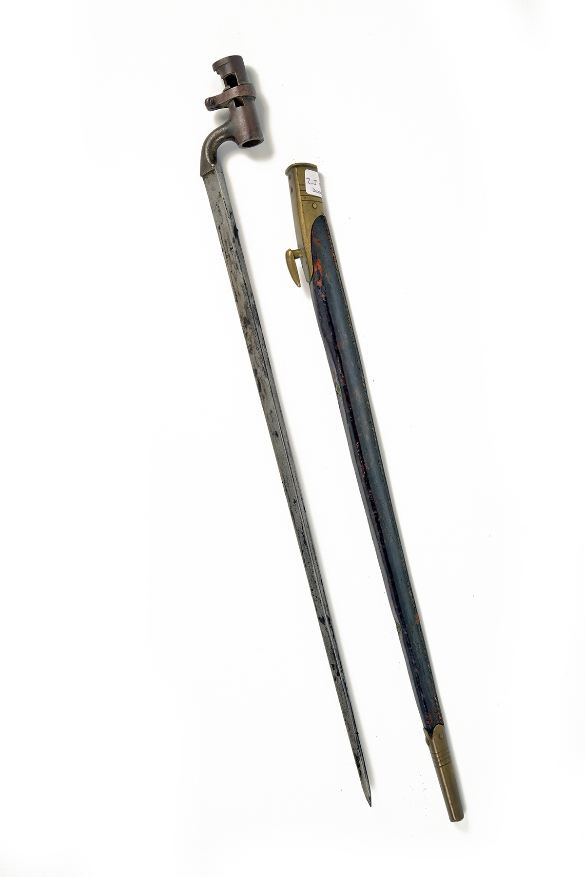 A PATTERN 1876 'LUNGER' BAYONET FOR THE MARTINI-HENRY RIFLE, circa 1880s, with 21 1/2 in. triangular steel blade fullered on each side, ricasso with worn British Ordnance and inspection markings and 'sold out of service' mark, overstamped with Farsi script, socket muzzle ring cut through to extend the mortise, together with its black leather scabbard with brass fittings, 25 1/4 in. overall