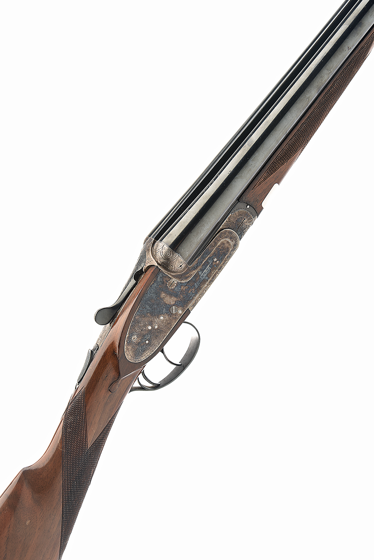 VICTOR SARASQUETA 12-BORE SIDELOCK EJECTOR, serial no. 238930, dated 1977, 28in. nitro barrels, 2 3/4in. chambers, bored approx. 1/2 and full choke, removable striker discs, automatic safety with gold-inlaid 'S detail, cocking indicators, border and acanthus scroll engraving, retaining much original colour-hardening and finish, 14 3/4in. stock, weight 7lb. 1oz.