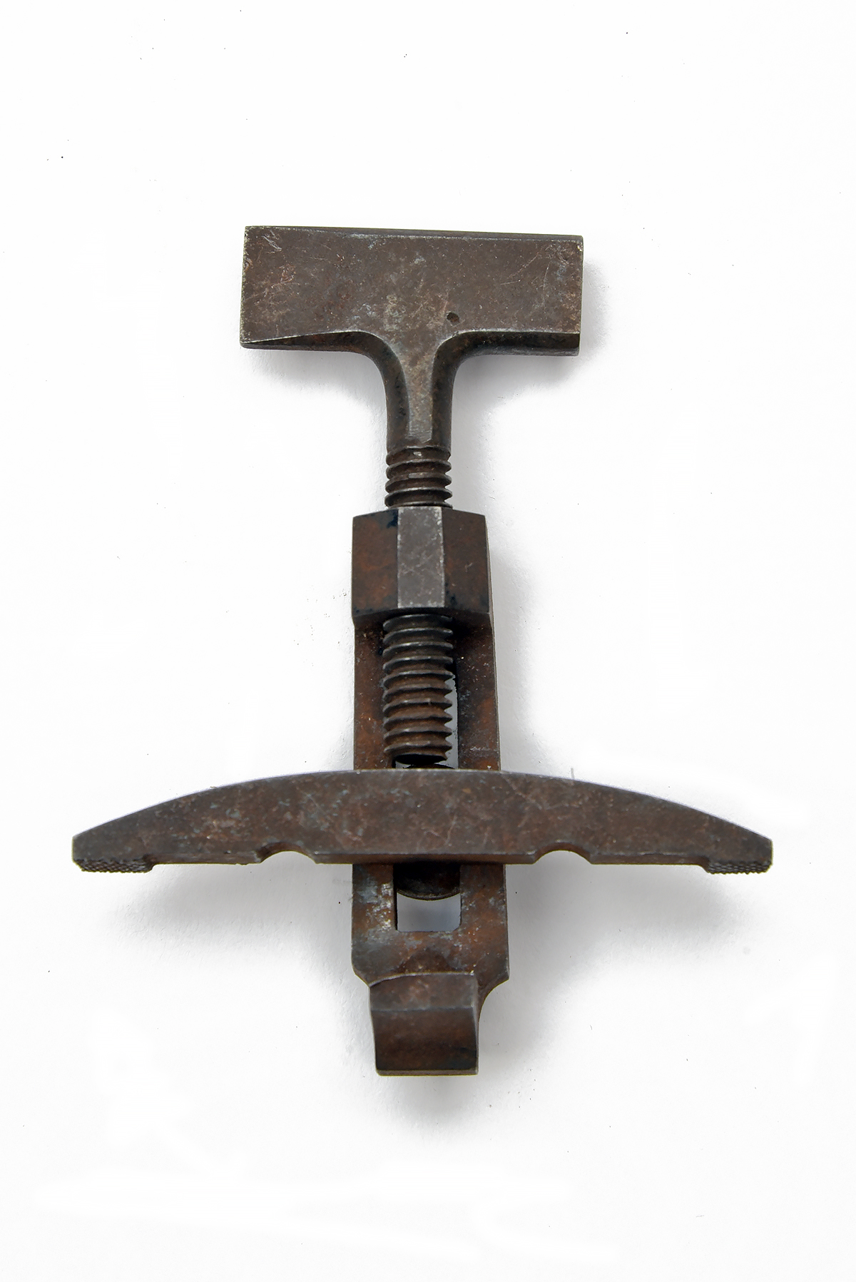 A GOOD LARGE MAINSPRING CRAMP, mid 19th Century, steel, 2 3/4 in. length closed, arm 2 1/2 in., good thread