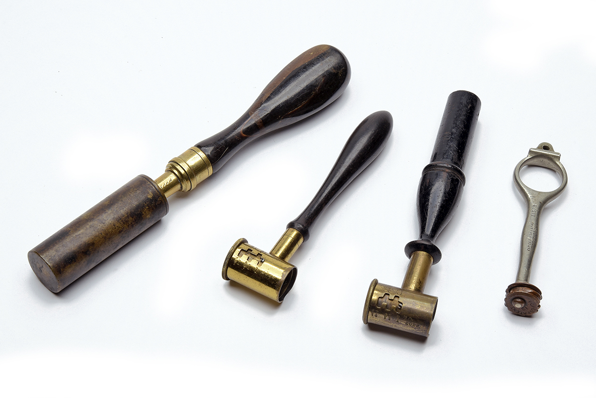 A GROUP OF FOUR SPORTING GUN ACCESSORIES, being two unnamed shot measures with ebony handles, a brass 12-bore chamber brush marked 'W. BARTRAM', and a 12-bore cartridge extractor with tool for removing paper cartridges, marked 'JAMES DIXON & SONS / SHEFFIELD'