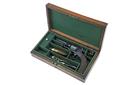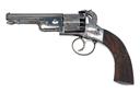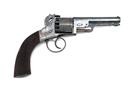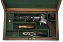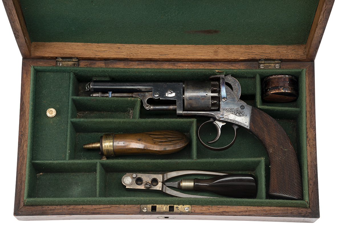 with 4 1/4in. octagonal Birmingham proofed barrel rifled with seven grooves, bead front-sight, the muzzle decorated with an engraved band and foliate scroll work at the breech, under barrel rammer of elegant form and design and held in place by a spring clip on the underside of the barrel near the muzzle, open top frame with fixed vee notch rearsight located on a standing platform projecting from the fixed breech, the left-hand side of the frame is fitted with a detachable plate to facilitate inspection and access to the lock mechanism, above this is fitted a spring safety that the hammer nose rests on when pushed in, the revolver has a cased hardened six shot cylinder (six shot cylinders are rare on English percussion revolvers), the chequered figured and flared long curving grips are fitted with an iron butt-cap with hinged trap for spare percussion caps, the frame butt-cap, trigger-guard and even the trigger are decorated with foliate scroll work, the revolver has virtually all its original finish, blue to barrel and frame and case colours to cylinder and butt-trap, the revolver is contained in its original green baize lined oak case with key, accessories include flask, mould, turnscrew and laquered cap tin, this is an exceptional piece, Webley Bentley revolvers are rarely found in this condition