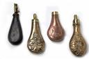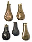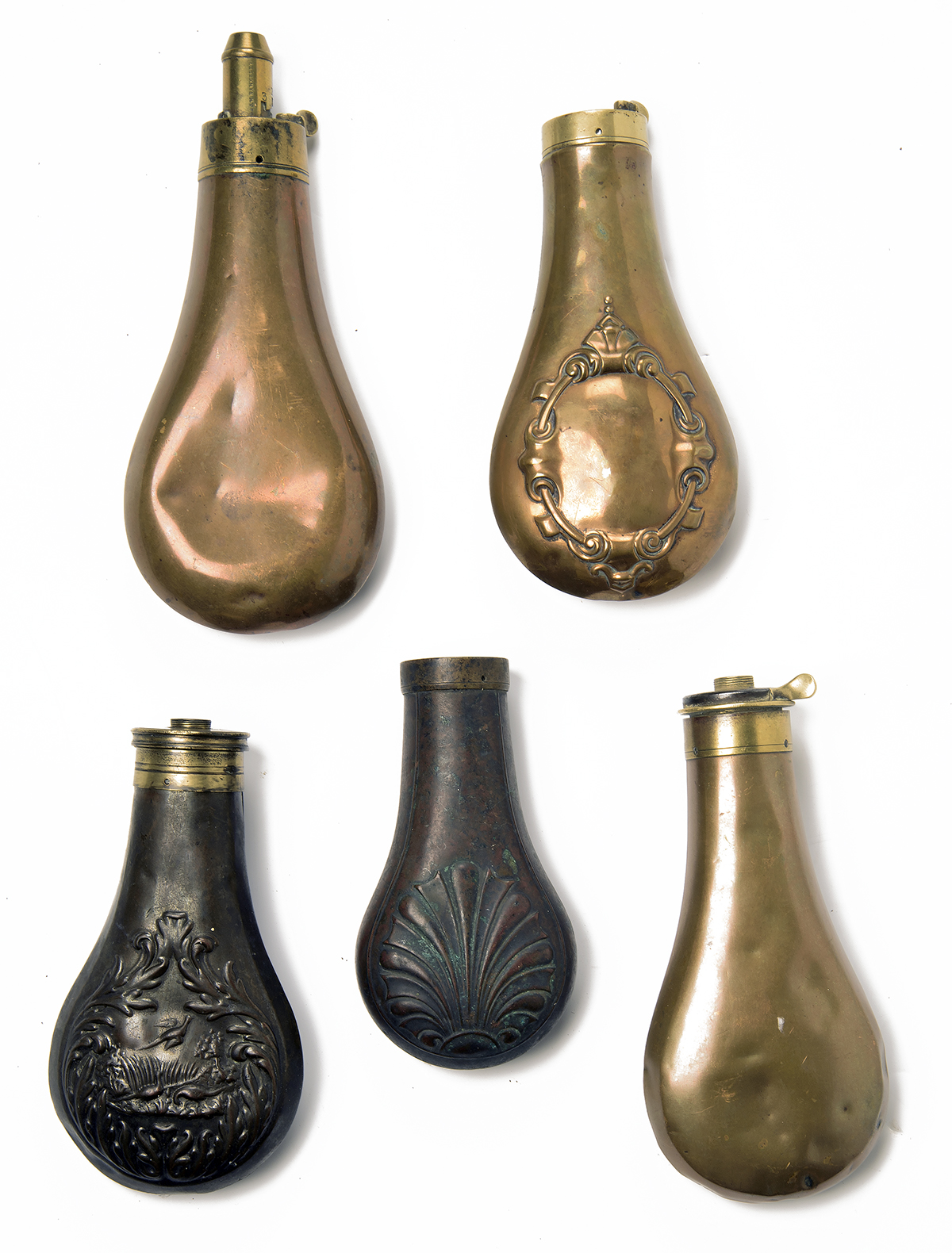A GROUP OF EIGHT COPPER AND BRASS POWDER FLASKS AND A SHOT FLASK FOR SPORTING GUNS, WITH FAULTS, 1) reproduction, embossed both sides,graduated spout, unmarked, shallow dent to body on one side, 8 in.; 2) embossed shell both sides, graduated spout marked 'G. & J.W. HAWKSLEY' heavily dented, broken spring, 8 in.; 3) plain bag, graduated spout marked 'G. & J.W. HAWKSLEY' heavily dented, broken spring, throat screw missing, 7 1/2 in.; 4) reproduction embossed both sides with hunter and dog, dented, missing cap, 5 1/2 in.; 5) plain bag, cap marked 'BARTRAM & Co', dented, missing spout, 7 in.; 6) emboSSed both sides with blank panel, dented, spring broken, no spout, 6 in.; 7) embossed both sides with pheasant scene, fire-proof spring, dented, missing spout, 6 in.; 8) embossed shell both sides, dented, missing spring and spout, 5 1/2 in,; 9) shot flask, brown leather, repaired neck on bag with modern brass screw, suspension ring and tab missing, 8 in.