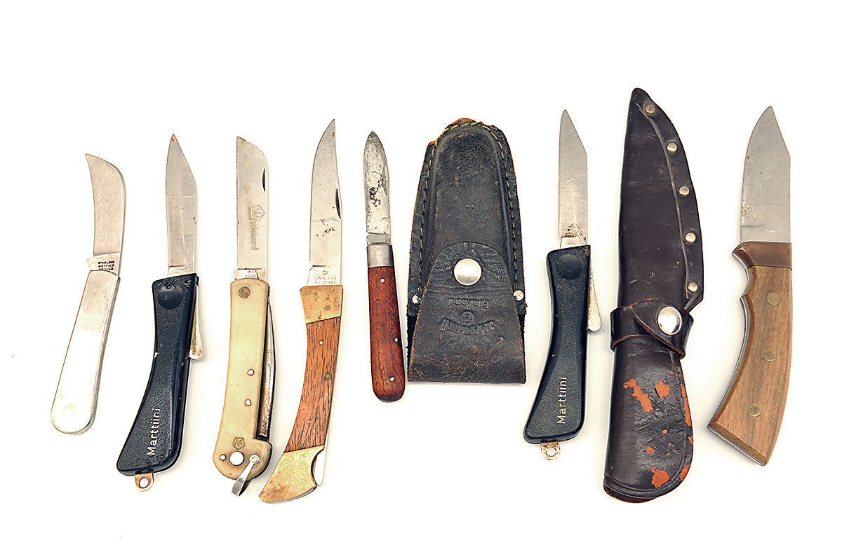 unsigned folding knife with wooden grip;