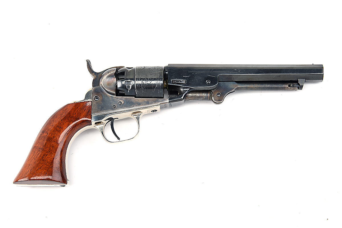 A BOXED REPRODUCTION .36 PERCUSSION REVOLVER SIGNED COLT, MODEL 'AUTHENTIC SIGNATURE SERIES POCKET OF NAVY CALIBRE' serial no. 60372, with blued octagonal5 1/2in. barrel, colour hardened open frame, roll engraved stepped cylinder and smooth walnut grip, in its maker's card and flock lined carton with instructions