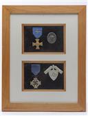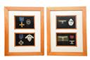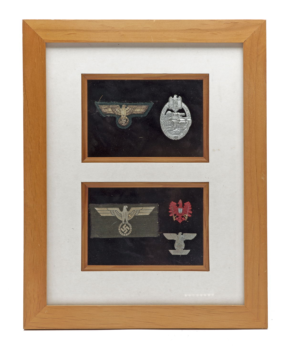 A PAIR OF WALL-MOUNTING FRAMES CONTAINING VARIOUS GERMAN THIRD REICH PATCHES AND AWARDS, includes Reichsarbeitsdienst badge, Black Wounds Badge, Tank Assault Badge, Heer 25 Year Service Medal, Civil Service Faithful Service Medal, etc., 9 items in total, believed to be original, nicely mounted in wooden frames