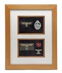 A PAIR OF WALL-MOUNTING FRAMES CONTAINING VARIOUS GERMAN THIRD REICH PATCHES AND AWARDS,