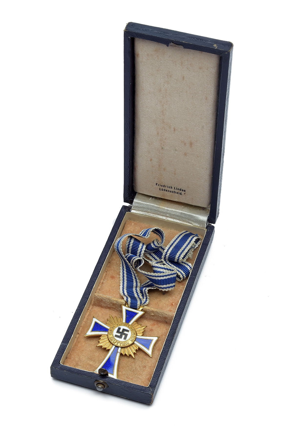 A GERMAN THIRD REICH CASED MOTHER'S CROSS IN GOLD, late 1930s, bronze gilt and enamel with original neck ribbon, on the reverse is a simulated inscription script dated "16 December 1938", with the signature of Adolf Hilter, together with its original case marked 'Frederick Linden / Ludenscheid.', with functioning clasp, small chips to the enamel on some of the cross arms, some foxing to the inside of the case with a little wear to the external corners