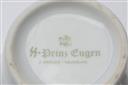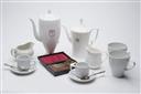 A COLLECTION OF SPURIOUSLY MARKED GERMAN WAFFEN SS CHINA, A SET OF SPOONS AND REPRODUCTION NAZI FLAG, comprising 1) 12 pieces of white bone china being a coffee-pot, a hot water jug [handle detached], a milk jug, a cream jug, x2 coffee mugs, x2 coffee cups and saucers, x2 9 in. side-plates, 12 pieces in total, all spuriously marked on the base in green glaze 'WAFFEN SS', or with various SS divisions [Wiking; Handschar; Prinz Eugen], some pieces with war-time year-dates and an incorrect 'BAUSCHER / WEIDEN' trademark; 2) a cased set of x6 original silver-plate teaspoons spuriously etched 'SS' on the handle, marked on the back 'D.B. 100' [for Düsseldorfer Besteckfabrik, '100' being the measure for the silvering], the case with an eagle and swastika badge spuriously glued to the lid; 3) a polyester Nazi flag, heavily stained, 5 ft x 3 ft approx.