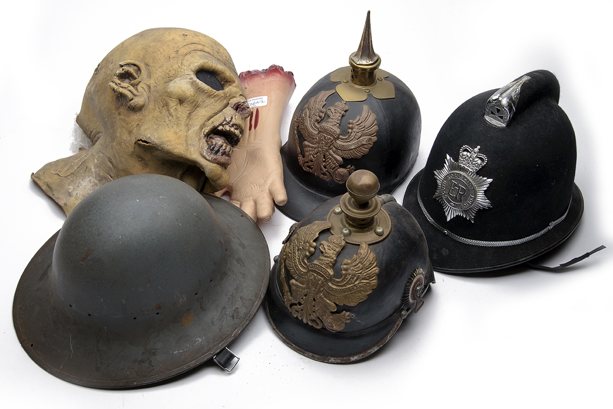 A GROUP OF FIVE SUNDRY ITEMS OF HEAD-GEAR, being 1) a 1980s ridged 'cox-comb police helmet badged to the South Yorkshire Police, complete with chin-strap, appears unused but has 'mothing' in places; 2) a German World War I pickelhaube with Prussian infantry plate, cockades in place, worn with rusting to steel fittings; 3) a World War II Zuckerman ARP helmet, worn with some rust patches; 4) a riding hat mocked up to resemble a German pickelhaube, plate appears genuine, 5) a rubber zombie head-mask, worn with splits, plus a plastic imitation bloodied hand and forearm