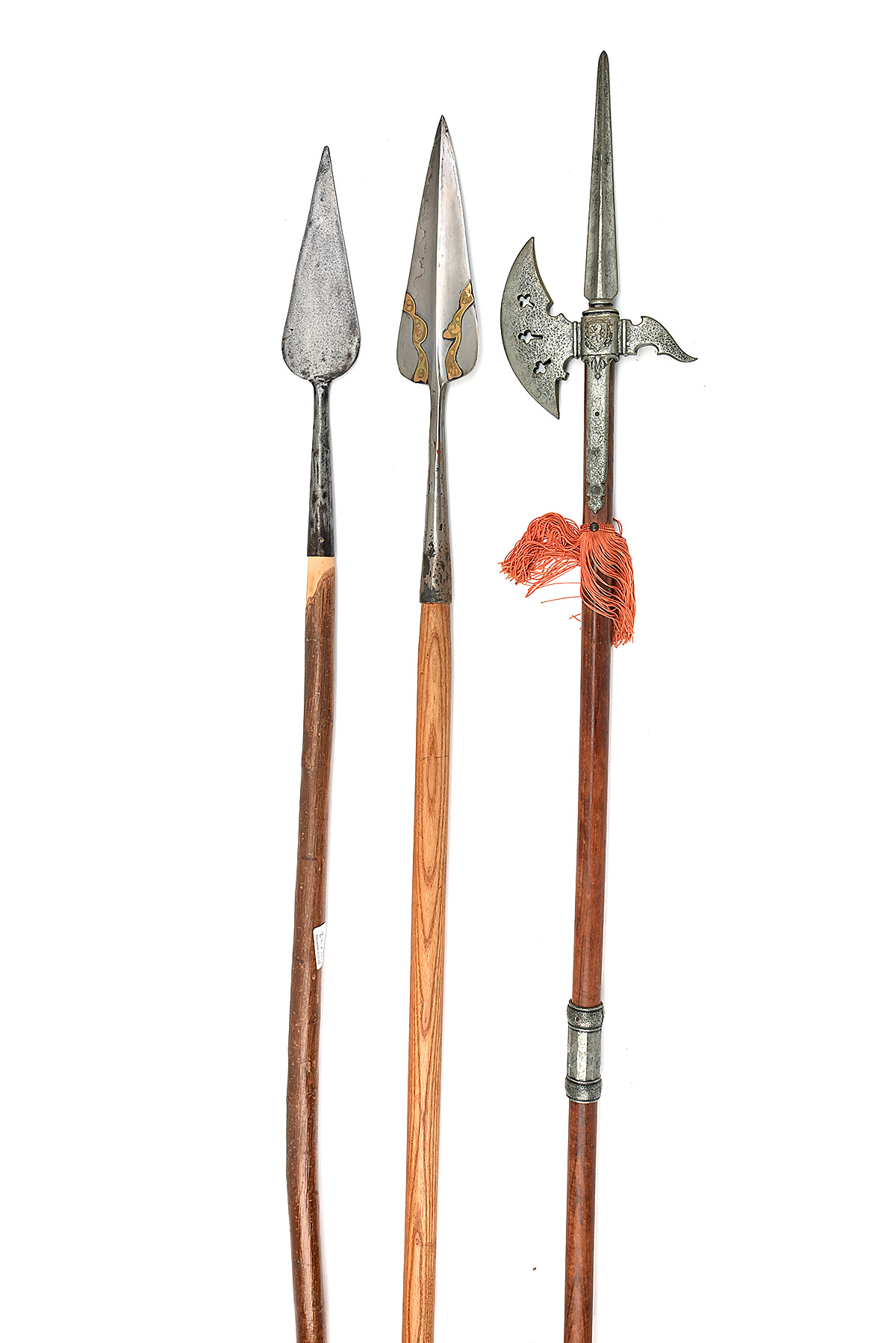A GROUP OF THREE REPRODUCTION POLE-ARMS, being 1) a halberd with cast head including a 9 in. spike, 7 in. X 3 in. axe and 2 3/4 in. x 1 1/2 in. beak, mounted to a wooden two-piece shaft with tassel decoration, riveted cast metal joint, 79 1/2 in. length; 2) spear with 10 in. steel blade with brass decoration socket-mounted to a wooden shaft with a brass-riveted steel terminal, 86 in. length; 3) spear with flat 9 in. blade socket-mounted to a natural wood shaft, 73 in. length